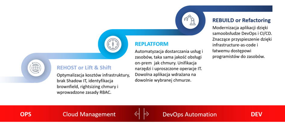 Zarządzanie zmianą w aplikacjach i infrastrukturze, orkiestracja, automatyzacja i spersonalizowany selfservice, gotowe integracje DevSecOps, pipeline’y, blueprinty, eksport/import skryptów, workflow, wsparcie dla IaC i CI/CD